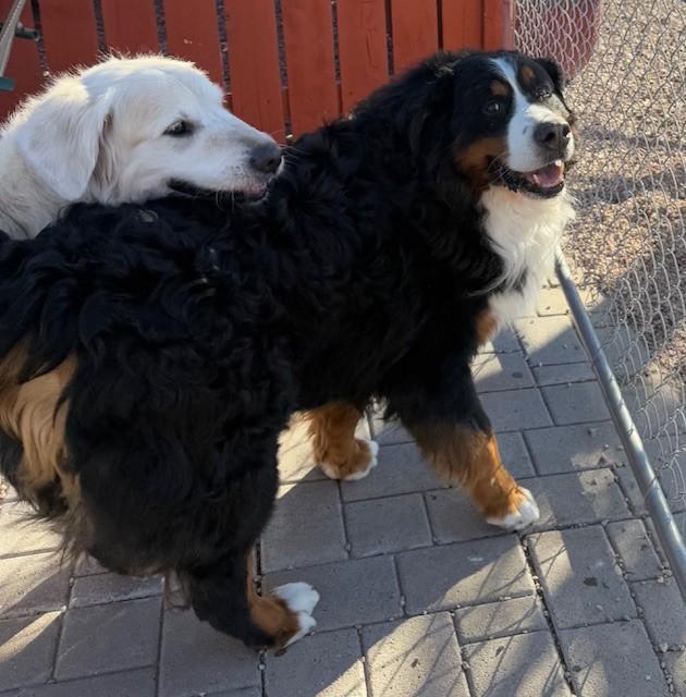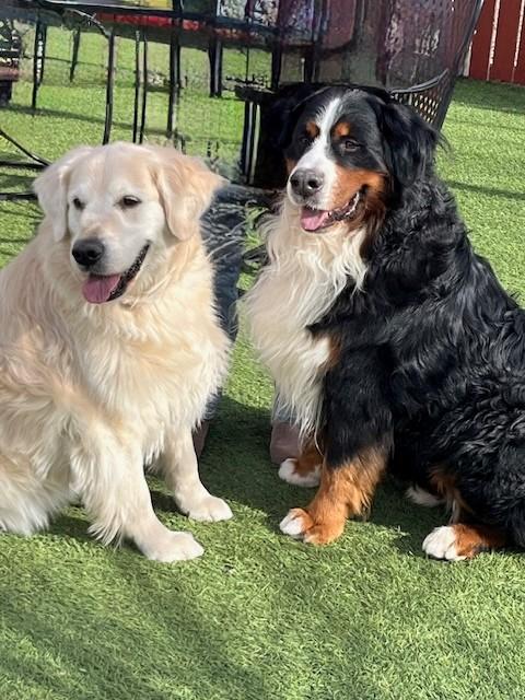 Zepher, a Golden Retriever, and Olly, a Bernese Mountain Dog, are a bonded pair who came into our care together and have been inseparable ever since. These sweet boys are gentle, good‑natured, and eager to please. They also LOVE to go on car rides!!